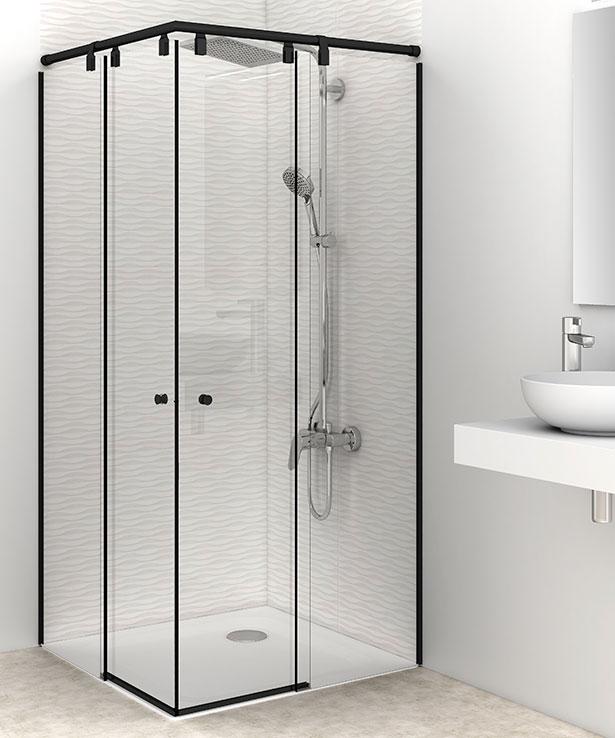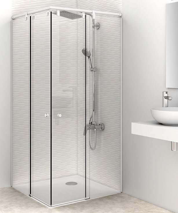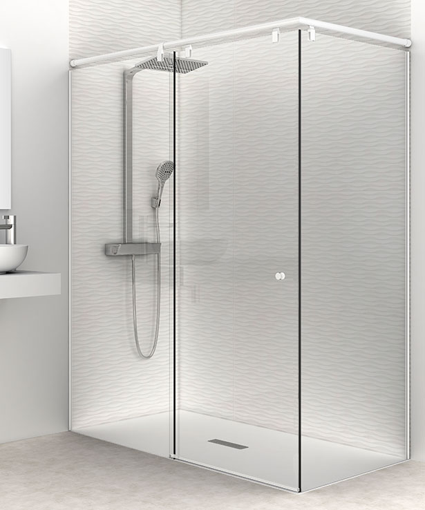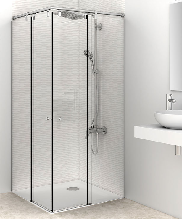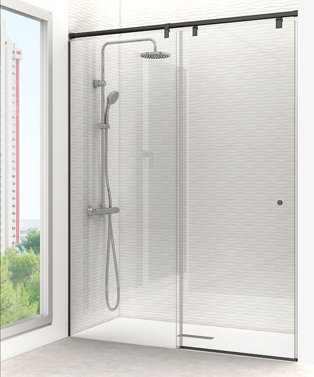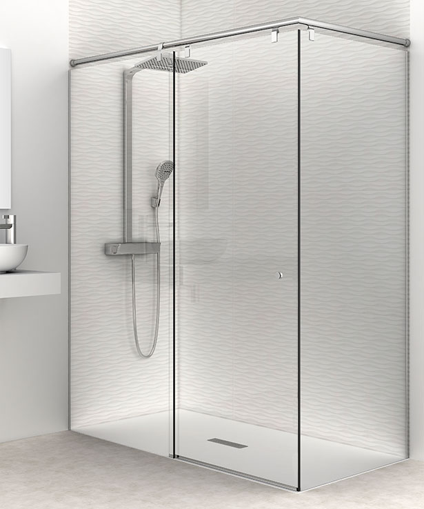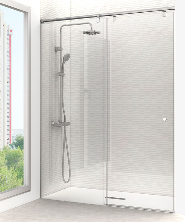 Sistema de cerramientos de ducha con vidrios fijos de 10 mm y puertas correderas en 8mm templadas. Guía superior aérea de acero inoxidable y juntas de última generación.